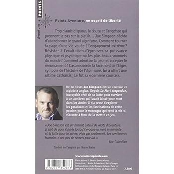 Ce livre est à la fois dans sa dernière partie la description d'une tentative d'ascension de la voie classique de la face nord de l'Eiger par Joe Simpson mais c'est aussi et c'est bien plus important à mes yeuxune réflexion sur les doutes qui le travaillent depuis quelques années avant cette tentative , sur la vie , sur la mort en particuliers celle des amis , c'est suffisamment rare qu'un alpiniste parle de trouille , de doute au sujet de son amour pour la montagne , Joe Simpson est cash , on peut l'en remercier .